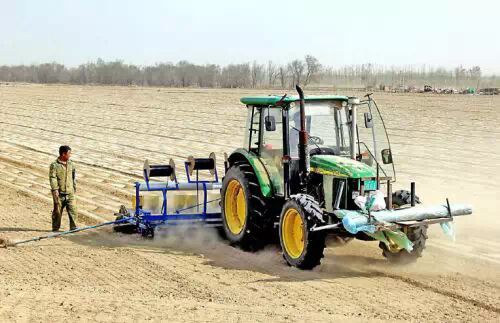4月15日,兵團第五師89團十三連的農田里,一輛運用衛星導航技術的大馬力拖拉機正牽引著新型滴灌超寬膜精量播種機在播種棉花。(來源:新疆經濟報)